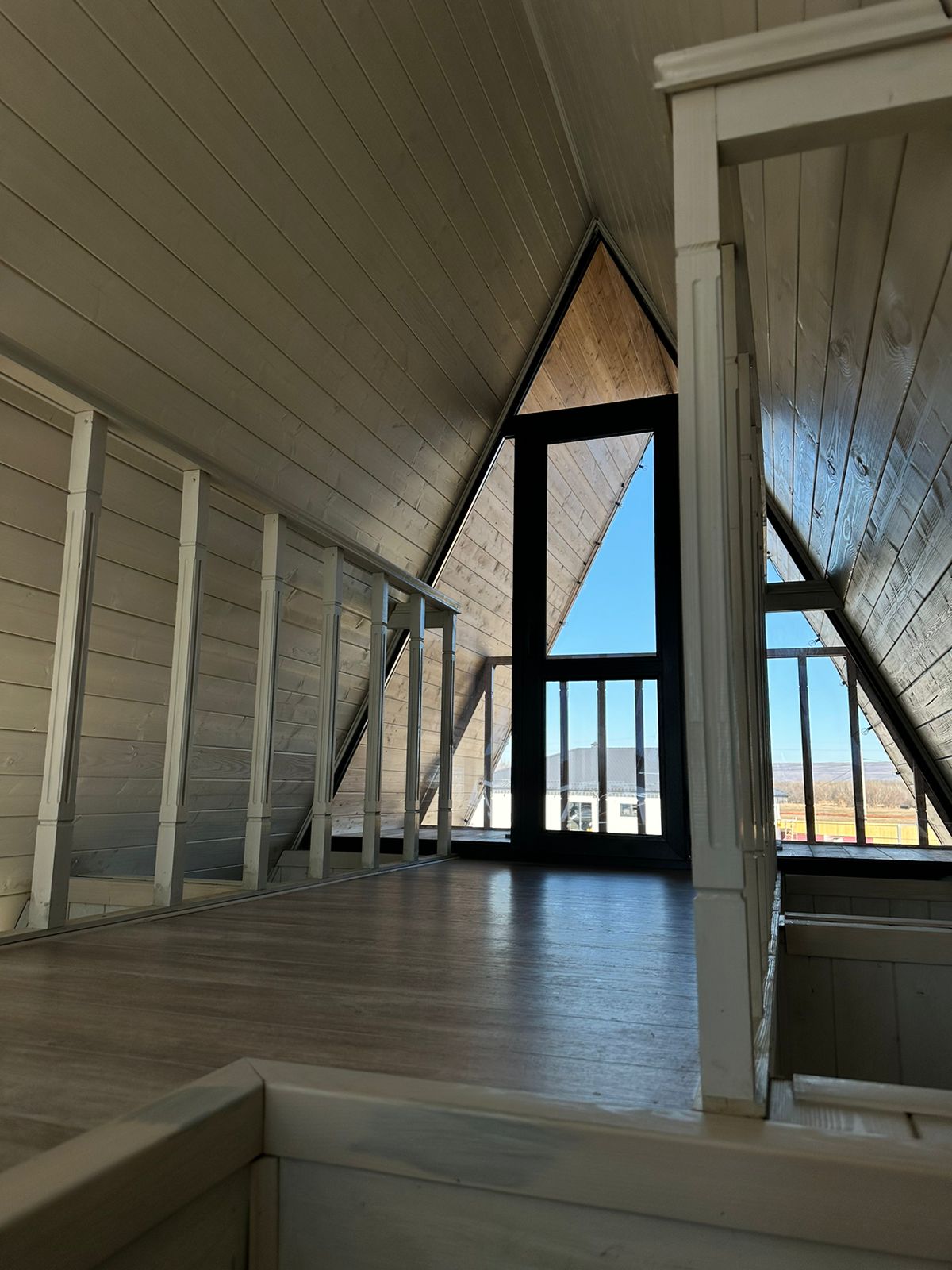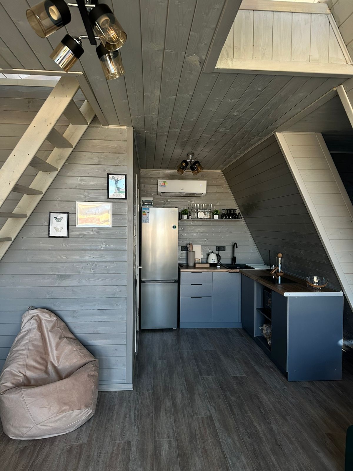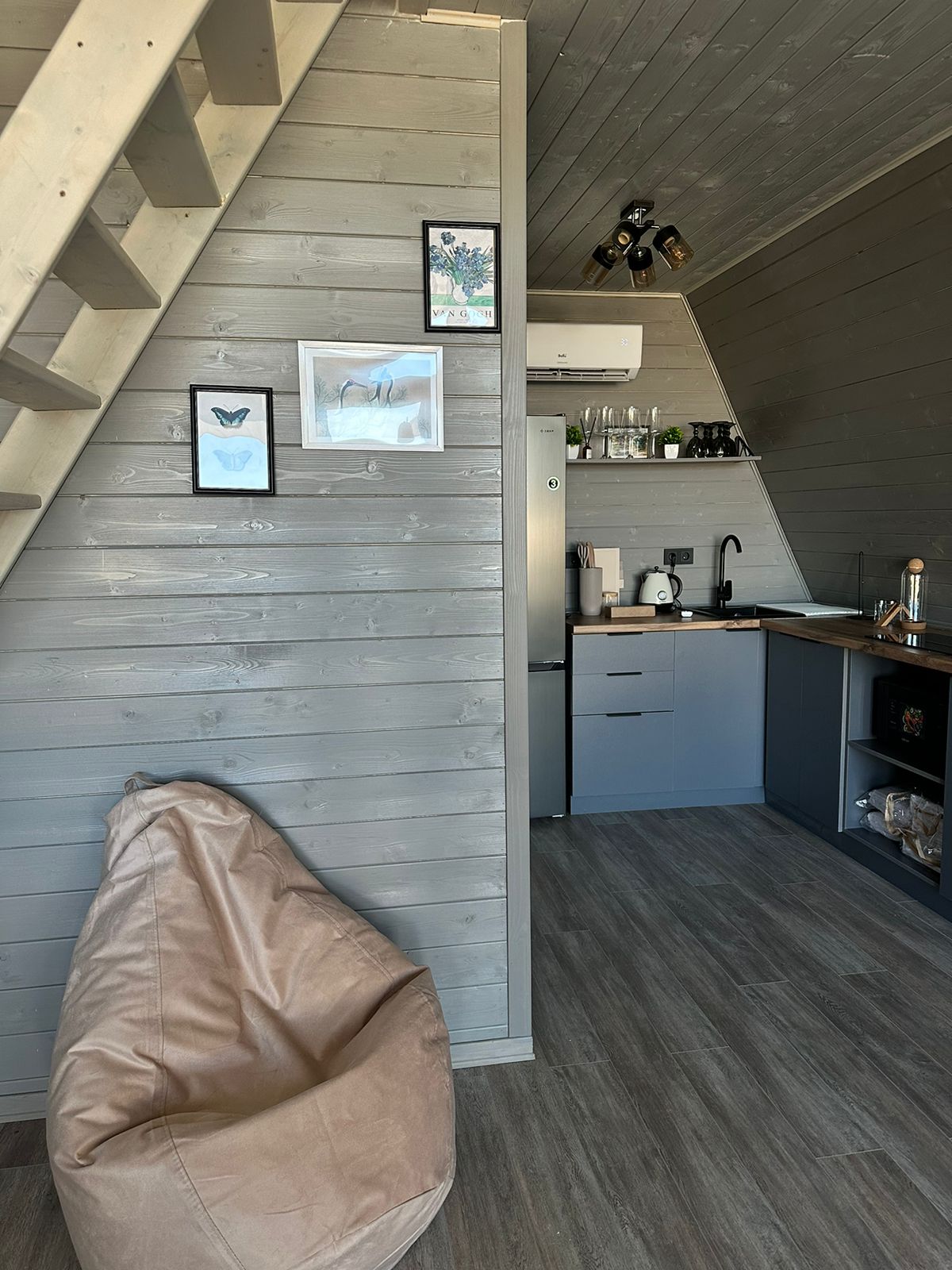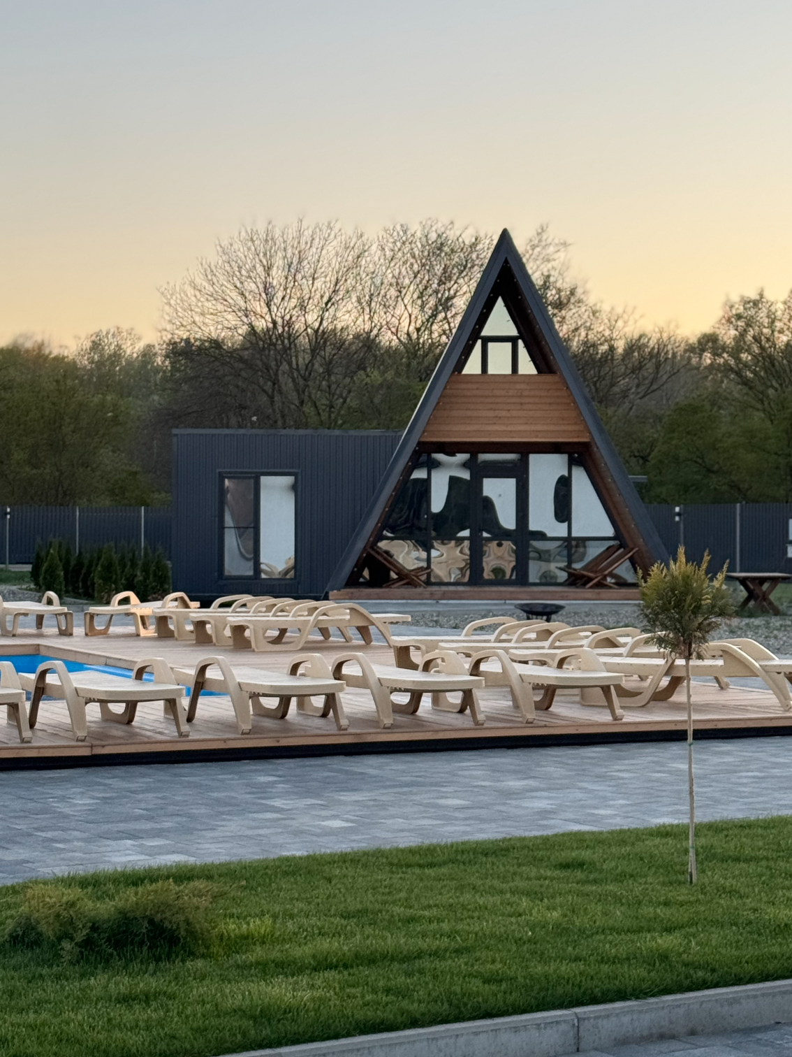 Зелёный домик — двухэтажный A-frame с панорамными окнами. Вмещает до 6 гостей. Внутри: кухня, гостиная, санузел, спальные зоны, кондиционер, Wi-Fi. На улице — своя мангальная зона.