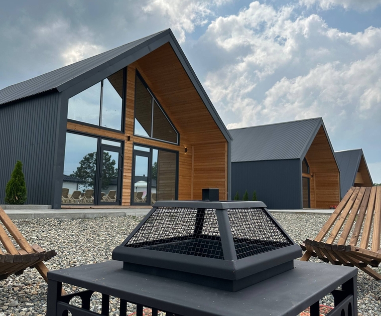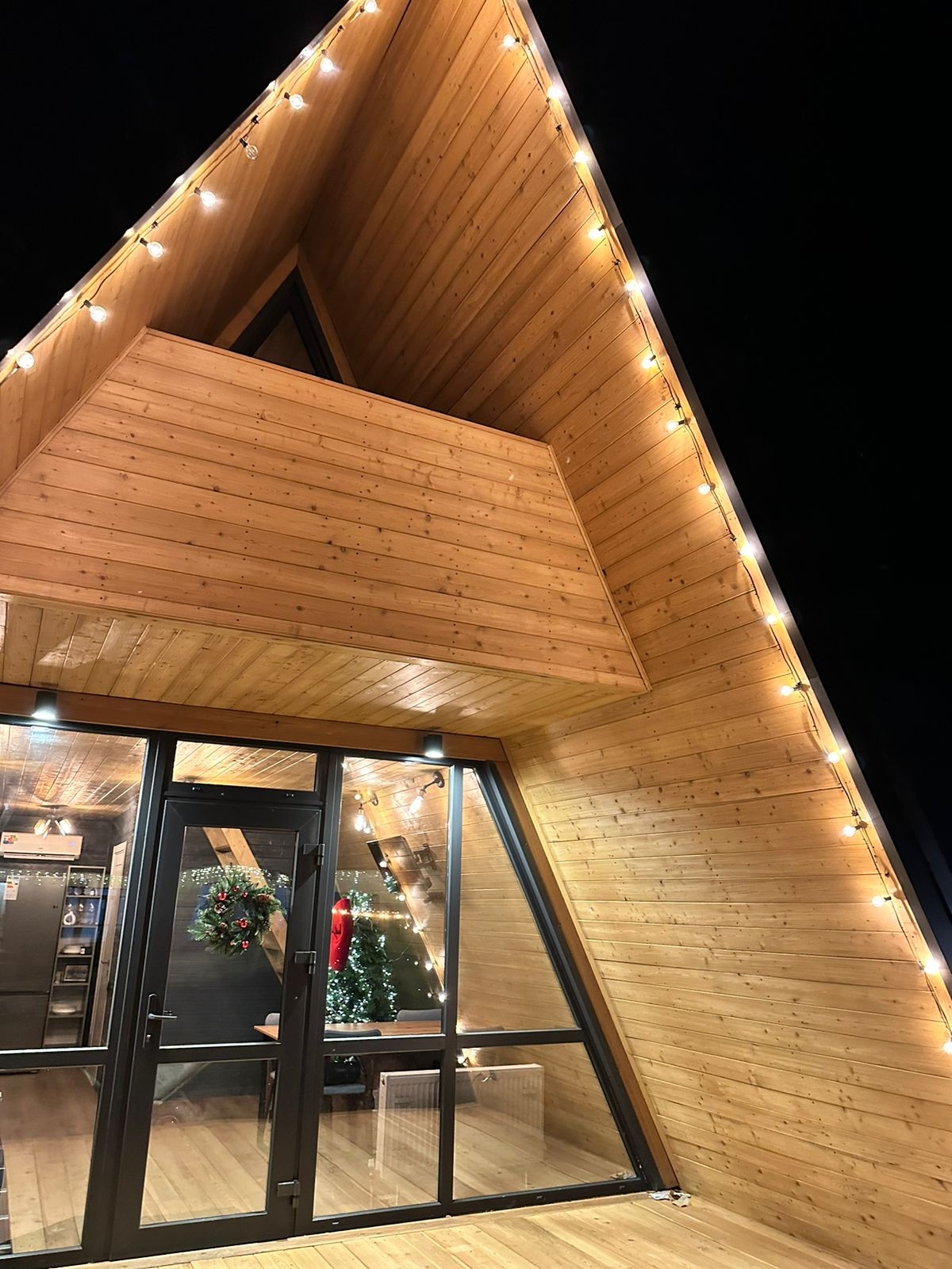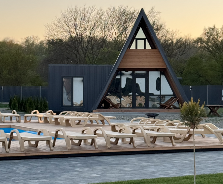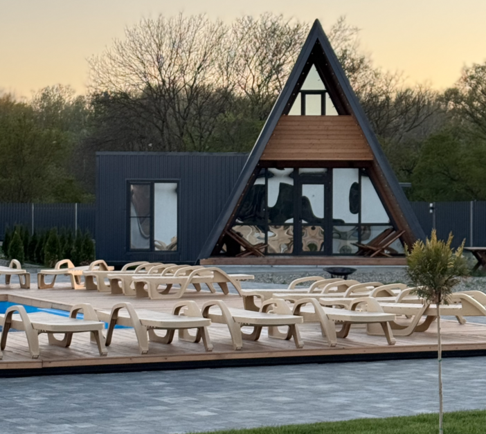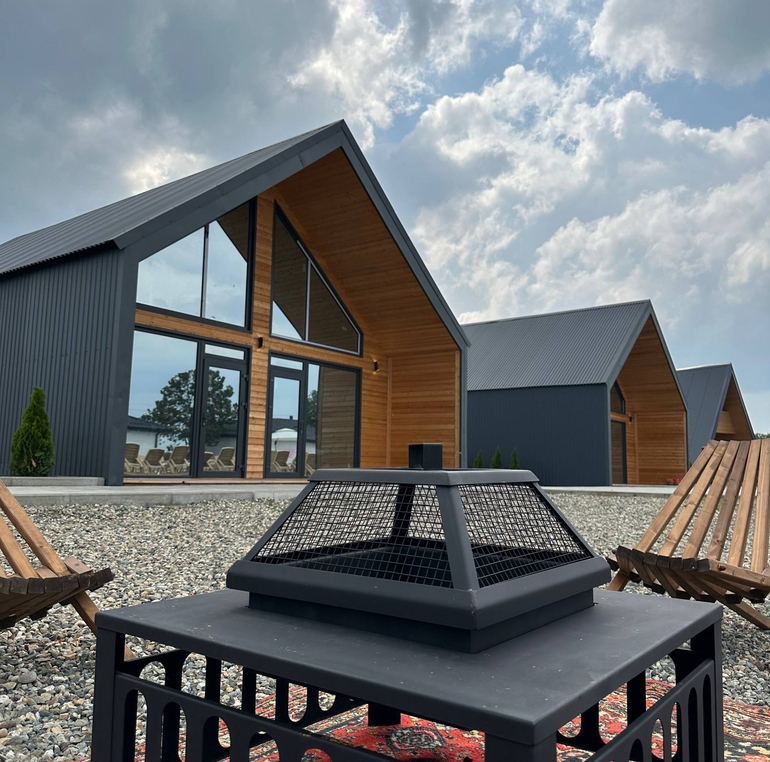 Зелёный домик — двухэтажный A-frame с панорамными окнами. Вмещает до 6 гостей. Внутри: кухня, гостиная, санузел, спальные зоны, кондиционер, Wi-Fi. На улице — своя мангальная зона.