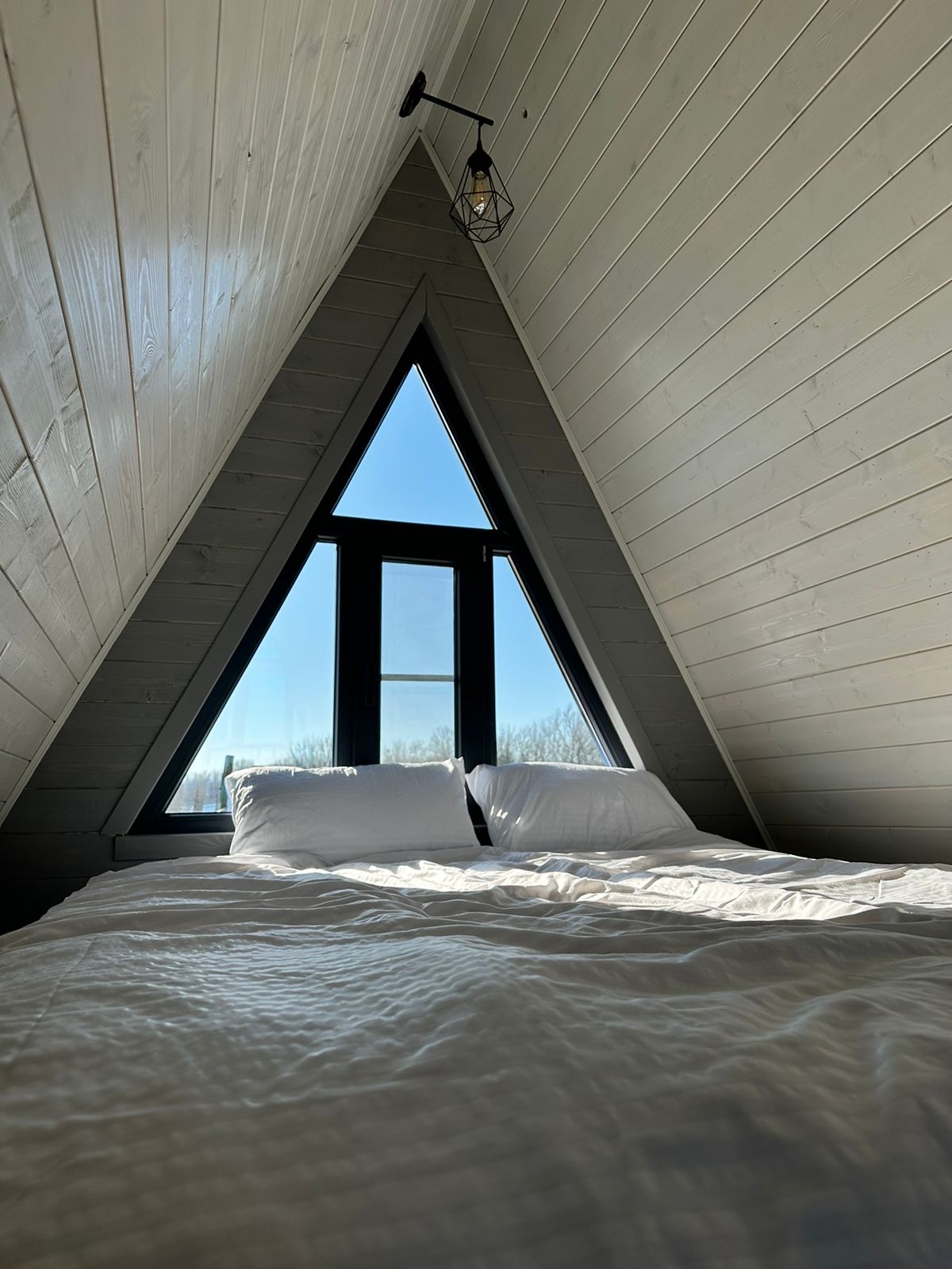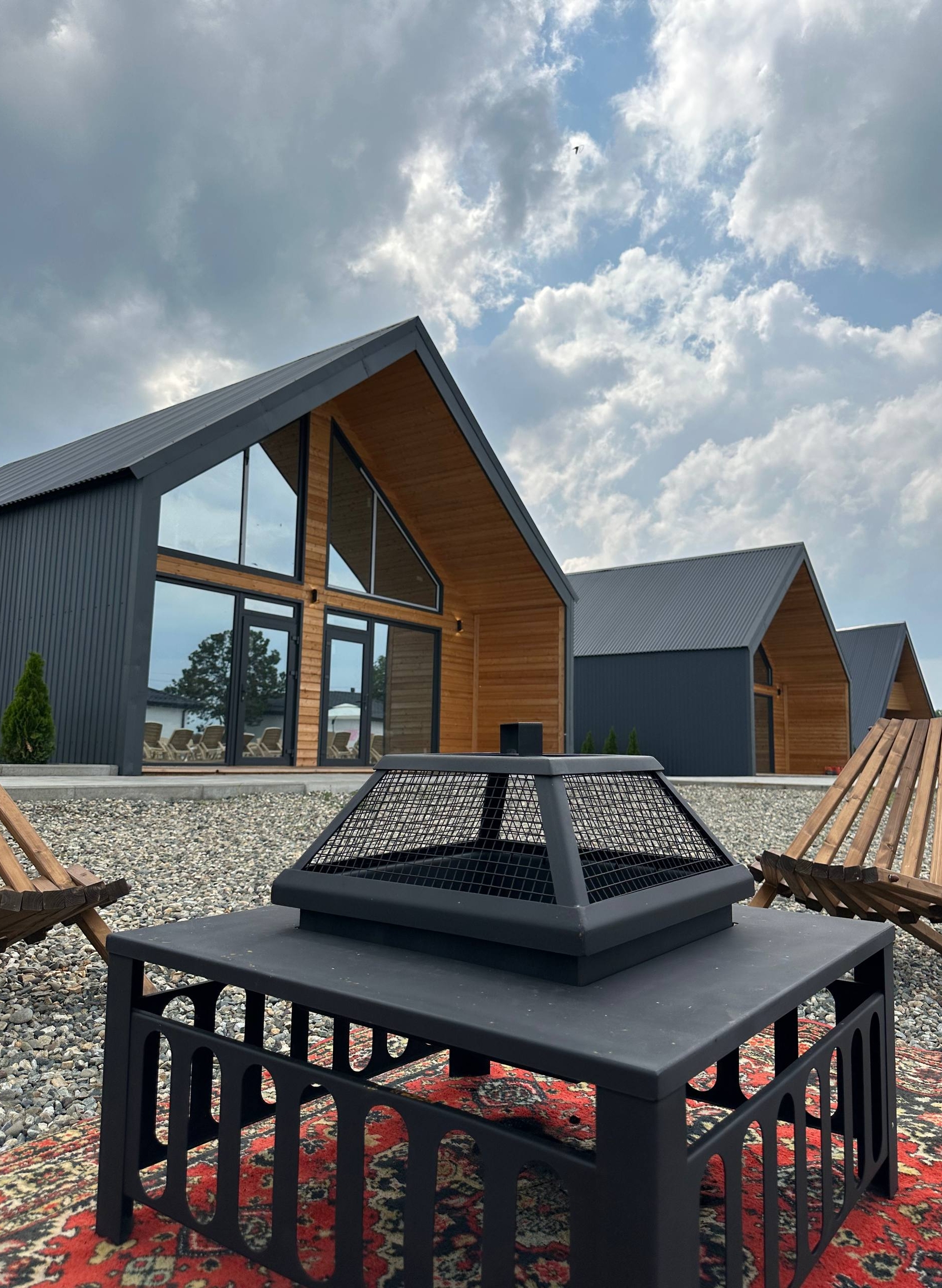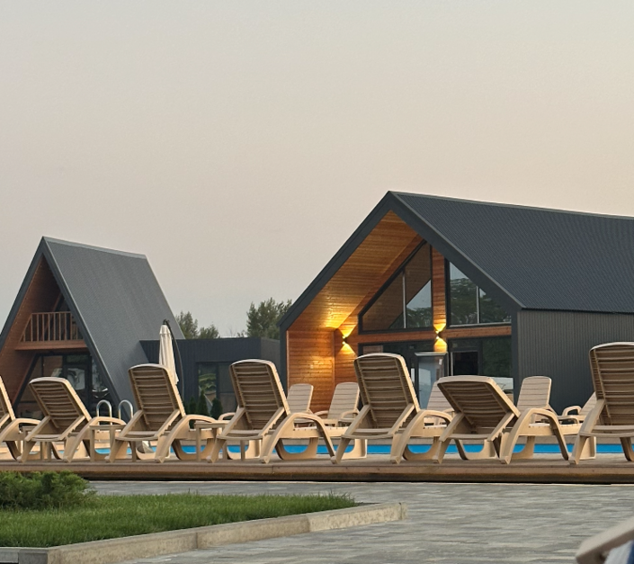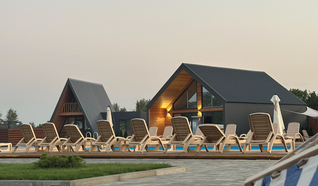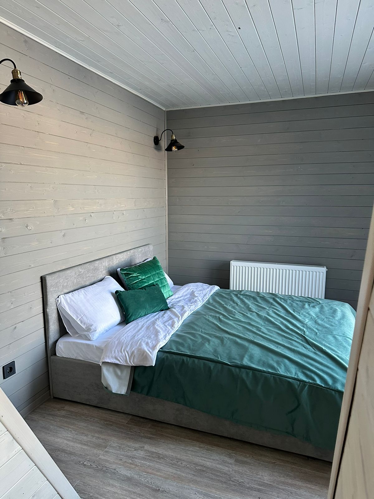 Зелёный домик — двухэтажный A-frame с панорамными окнами. Вмещает до 6 гостей. Внутри: кухня, гостиная, санузел, спальные зоны, кондиционер, Wi-Fi. На улице — своя мангальная зона.
